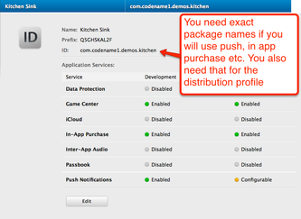 Make sure your provisioning profile’s app id matches your package name or is a * provisioning profile. Both are sampled in the pictures below, notice that you would need an actual package name for push/in-app-purchase support as well as for app store distribution.